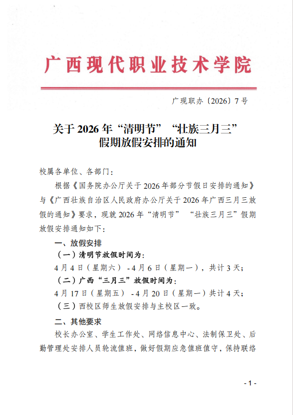 关于 2026 年“清明节”“壮族三月三” 假期放假安排的通知 来源:商学院办公室 发布时间:2026-03-30 09:34:16 浏览次数: 次 【字体:小 大】 终审:gxxdjgx002 【打印正文】 相关信息