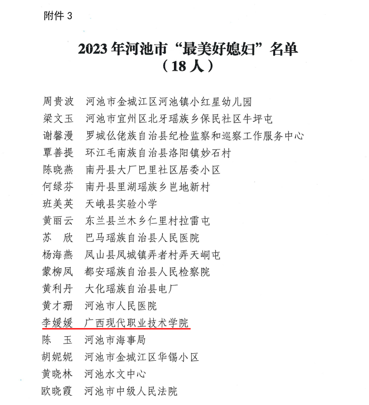 为深入贯彻落实习近平总书记关于注重家庭家教家风建设的重要论述,团结引领广大家庭、基层妇联干部、妇女群众感党恩、听党话、跟党走,营造向上、向善的良好社会氛围。2023年3月,河池市妇联在全市范围内开展寻找河池市“最美”系列活动,经过组织推荐、评审、公示,决定对全市34个“最美家庭”、10名“好婆婆”、 18名“好媳妇”等名单进行揭晓并表彰。其中,商学院李媛媛院长荣获2023年河池市“好媳妇”荣誉称号。