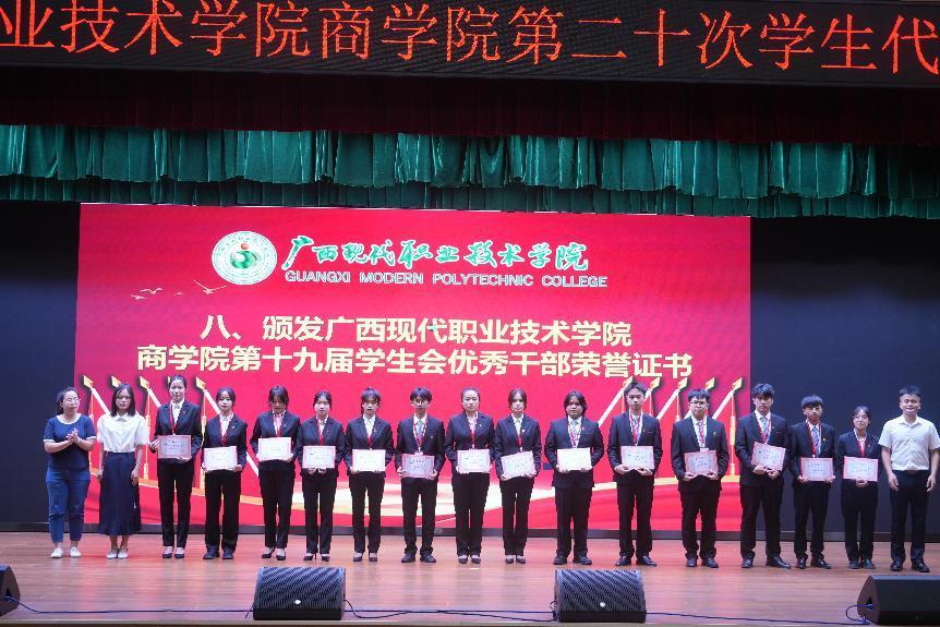 2023年6月8日晚上19点30,广西现代职业技术学院商学院第二十次学生代表大会在综合楼二楼东面报告厅顺利召开,出席本次大会的领导、老师有商学院党支部书记卢绍迎,商学院副院长潘杨、商学院办公室主任余蓉、学校团委书记助理廖明亚、商学院分团委书记王有能、商学院教务秘书卢倩倩以及商学院班主任、辅导员教师代表。